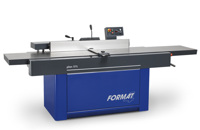 The solid plan 51L planer from the premium brand FORMAT-4 impresses with its new design and above all with the new three metre planing table length. The feeding planer table alone offers 1,650 millimetres of adequate supporting surface for larger dimensioned workpieces. As an absolute highlight, the new plan 51L is the first FORMAT-4 planer that offers a tiltable planing table for concave and convex joint finishing. The space saving design of the planing fence makes it possible to position the planer directly against the workshop wall. The comfort guard is integrated into the machine chassis and can be folded away which, when coupled, with the counter design of the machine cover panel allows absolute freedom of movement when planing. The Power Drive electrical height adjustment is included as standard and offers operating comfort of the highest level. The ergonomically designed control panel is positioned at eye level.